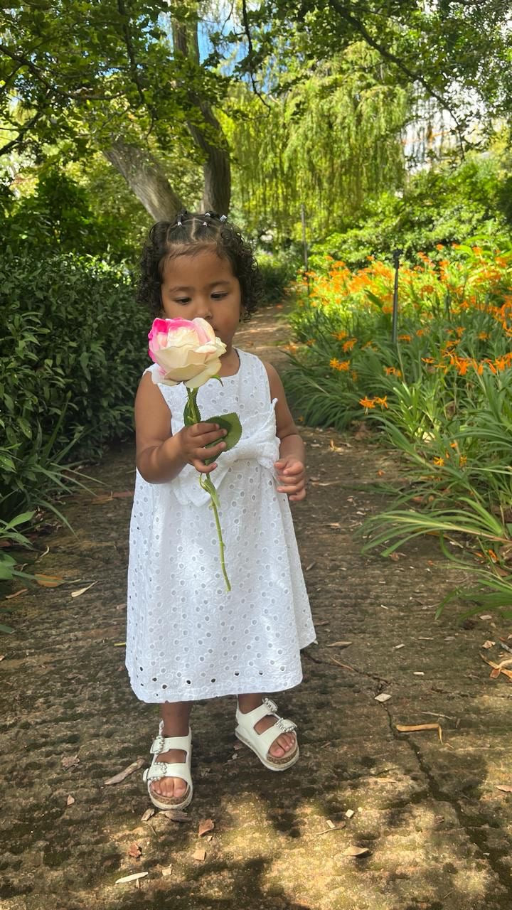 A SLEEVELESS DRESS DESIGNED IN 100% COTTOM ANGLAISE, PERFECTLY LINED WITH BUTTON CLOSURES AT THE BACK AND A FRONT BOW DETAIL CENTRE.