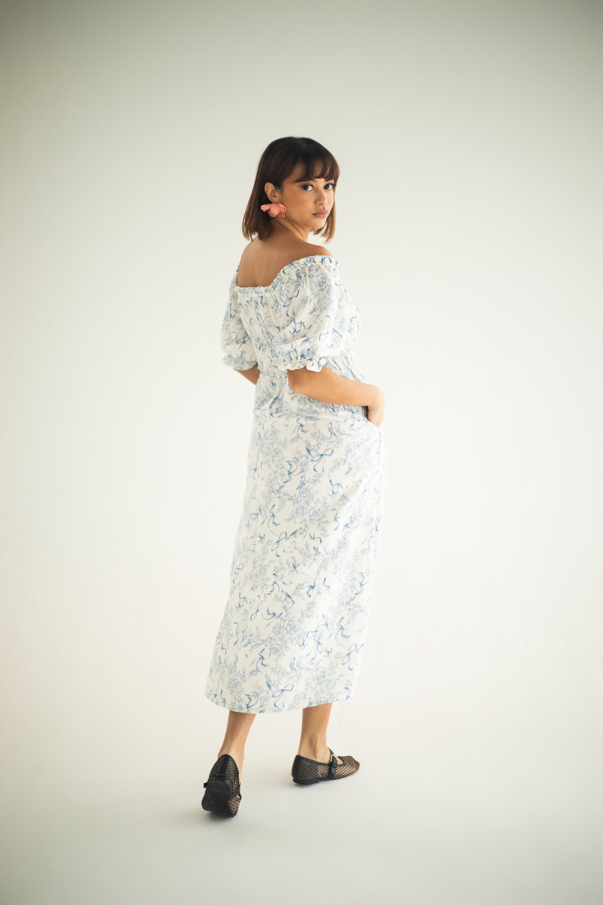 A SMOCKED BODICE THAT CAN BE WORN ON OR OFF THE SHOULDERS, DESÍGNED IN A SOFT BLUE ROMÁNTICA BOW PRINT.
