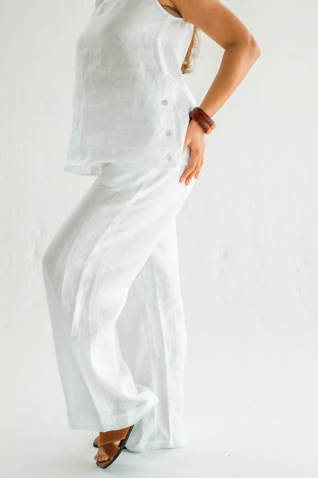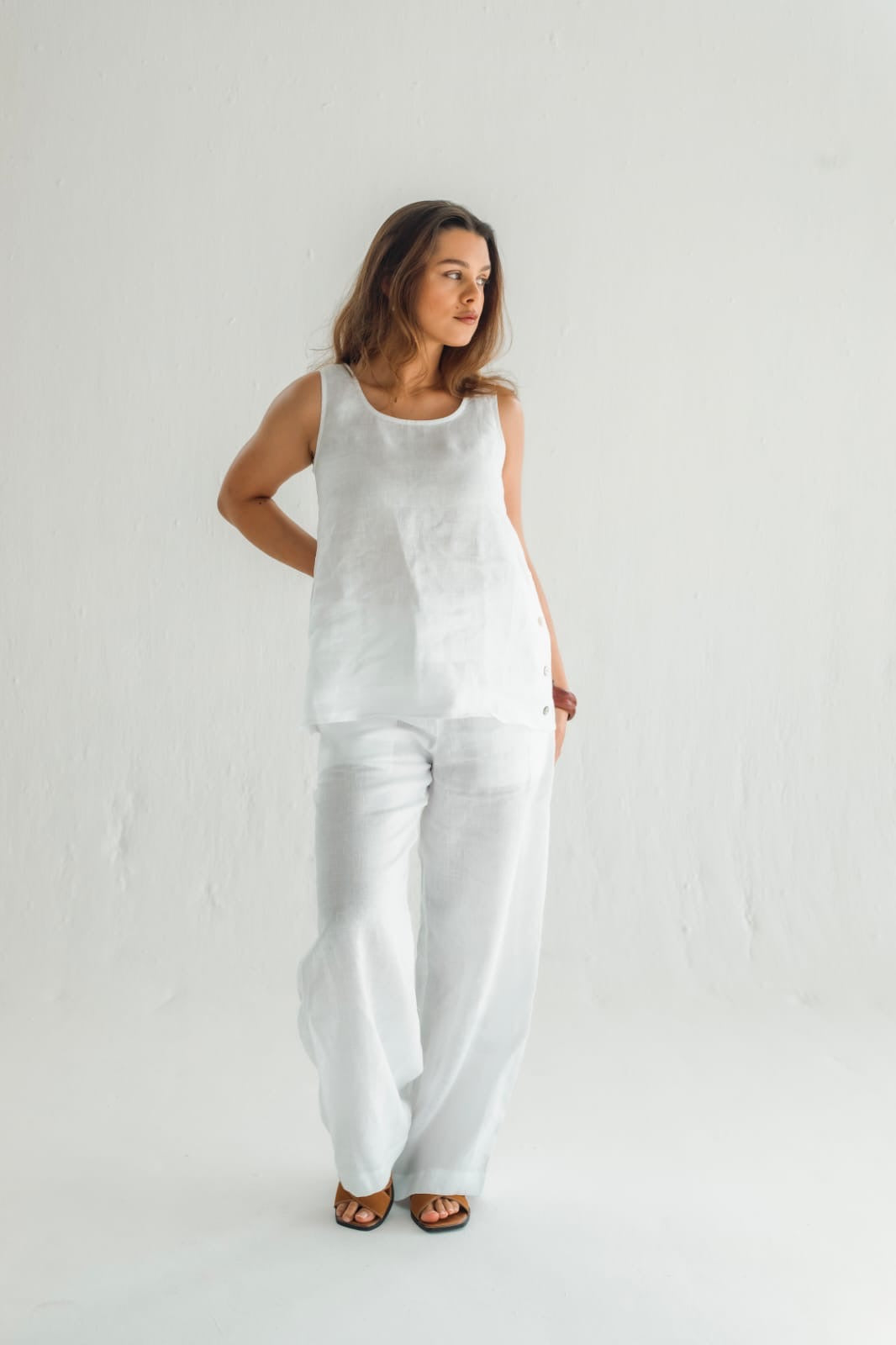 AN EASY-BREEZY TANK TOP DESIGNED IN 100% LINEN FEATURING MOTHER OF PEARL BUTTON DETAILING